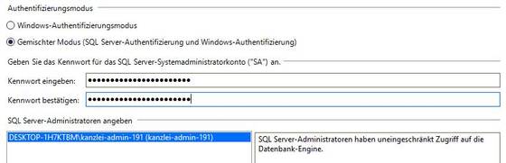 So haben wir das Formular ausgefüllt - mit "SA" Passwort