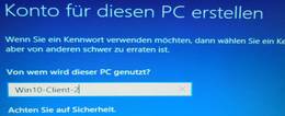 Da wir den Netzwerk-Stecker gezogen haben, muß der Installer ein lokales Konto anlegen, kein Konto drüben in USA. Dennoch sollten sie einen unverfänglichen Namen vergeben, schon gar keine persönliche Identifkation. Wir wissen nämlich nicht, was bei den vielen zukünftigen automatischen stundenlangen Updates alles nach USA transferiert wird.