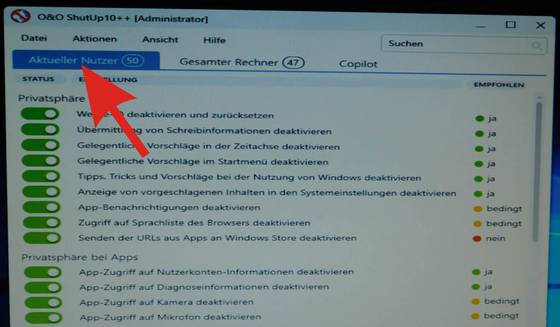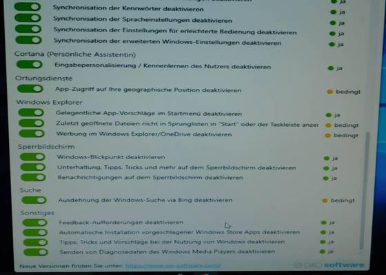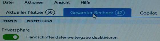 Das hier ist ein Foto der 2016er version "vor" den ganzen Updates bis 2025 - 50 Schalter für den aktuellen Benutzer und 47 Schalter für das gesamte System. Sie werden überrascht sein, was durch die Updates an Spionage-Schaltern dazu kommen wird. Es sind auf einmal 93 + 108 Schalter, die Sie wieder umschalten müssen.