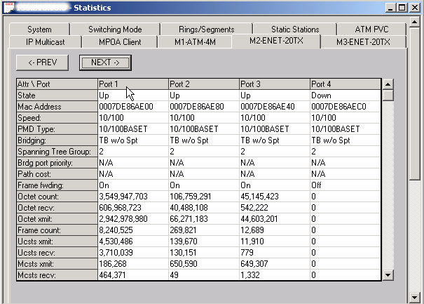 Wir wollen und müssen die Counter (Zähler) für diesen Port abfragen können. Eigentlich einfach, dachten wir, aber es ist nicht so. Auf der statischen Statistikseite unserer Centillion Speedview 5.1 Software stellte sich das so dar: