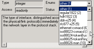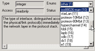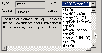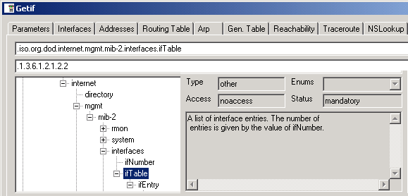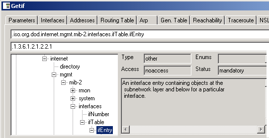 Schaun Sie sich den Baum an, den wir hier herunter gehangelt sind. Über "iso, org, dod, internet, mgmt, mib-2, interfaces, ifTable, ifEntry" wird jeweils im rechten Fenster ein zugehöriger Text angezeigt, was das bedeutet und wo wir gerade gelandet sind.