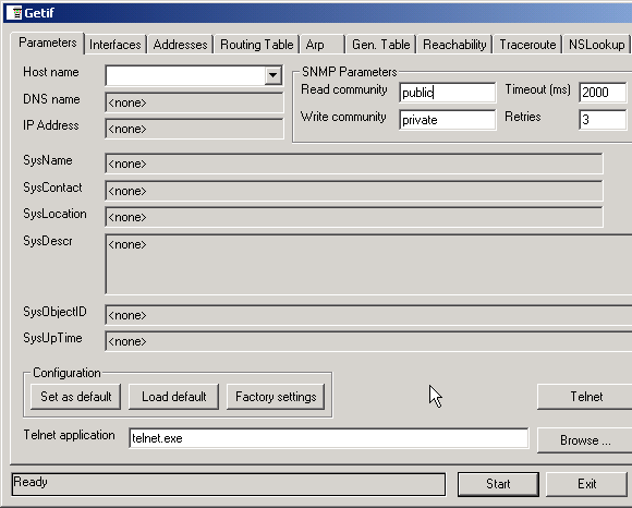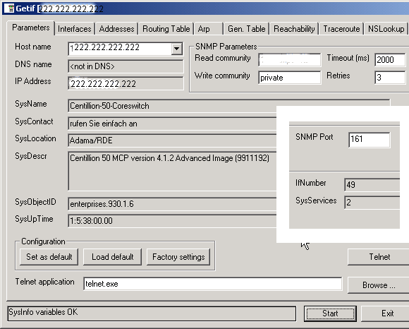 Tragen Sie die IP Nummer des Administrations Interfaces des Switches oder Servers ein und drücken Sie auf "Start". Wenn die IP Nummer stimmt und mindestens das GET Passwort (hier heißt es Read Community) korrekt ist (also das neue Passwort anstelle von "public"), werden die minimalen Daten des Switches oder Servers angezeigt.