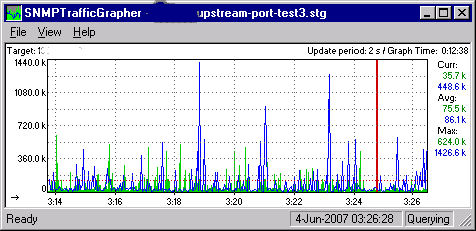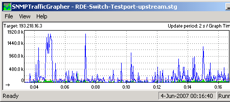 Hier das Erfolgserlebnis im 2s Takt, stg.exe zeigt den Traffic unseres Uplinks an, nachts um 3 Uhr 26. So können Sie auch sehen, warum die EDV Menschen immer nachts so lange arbeiten - eben bis es geht.